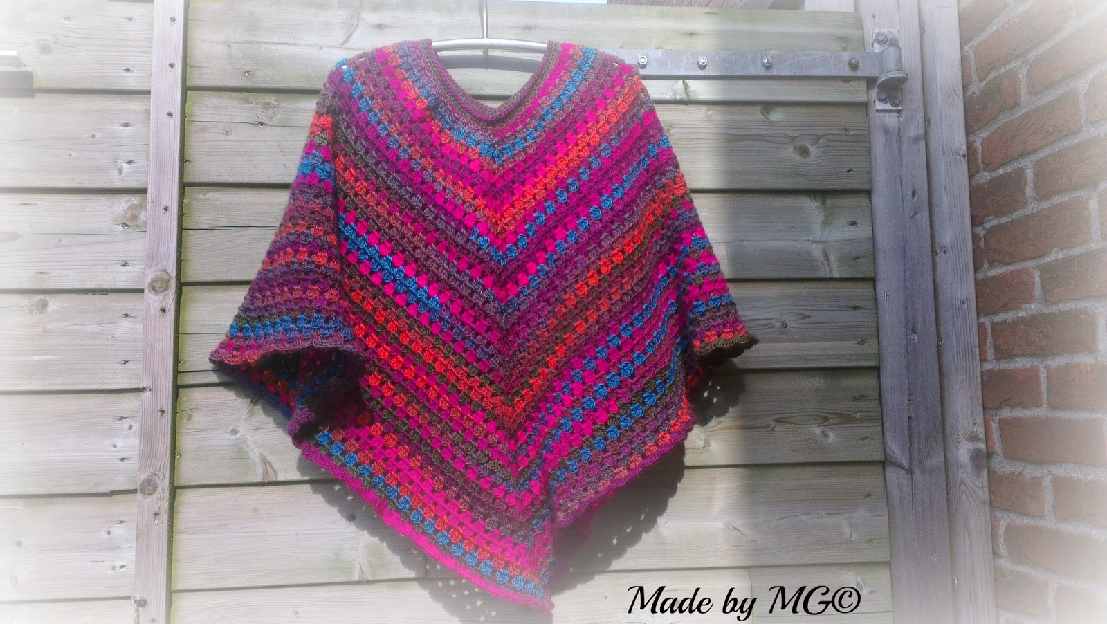 Inmiddels had ik m'n gedachte laten gaan wat ik ervan wilde maken. Een poncho, lekker voor de wat koelere zomer avonden. Zo gezegd zo gedaan, ik ging aan de slag. Bedacht nog dat het een projectje voor in de tuin moest worden, lekker uit het blote koppie, in de zon en ontspannen.